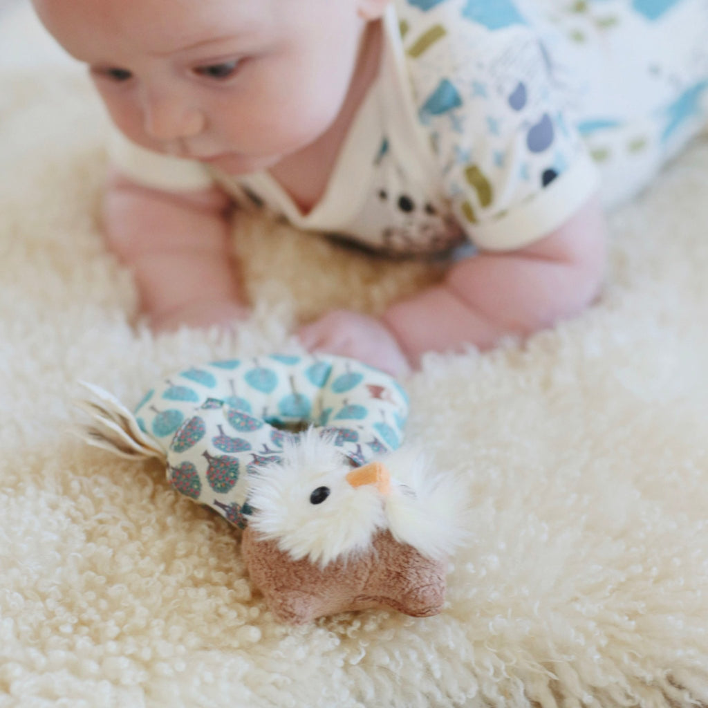 100% Organic Luxury Owl Patterned Soft Rattle. Features an allover print with tiny plants. Stuffed to be firm with natural corn fiber, this soft friendly teether is perfect to sooth baby's aching gums. A rattle sounds when the toy is shaken. Made from organic and eco-friendly materials. No hidden polyester.