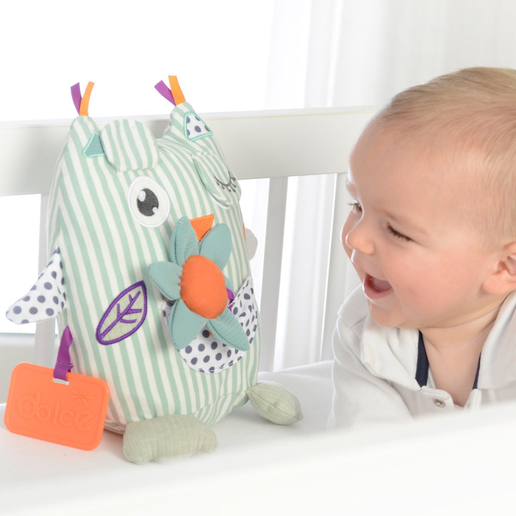 This pretty owl can either be asleep or awake, as it comes with a unique and adorable lifting eyelids feature. On its pocket, a colorful, removable flower can be squeaked. There is also rattle and crinkle on each side. The owl has ribbon ears that children can play with for fun and as a way to improve their color recognition development. Presented on a Dolce branded hanging hook.