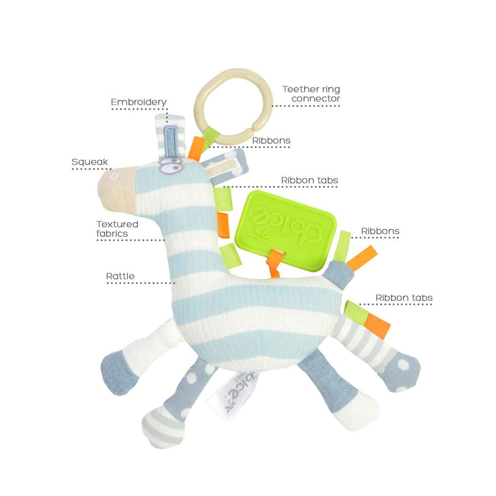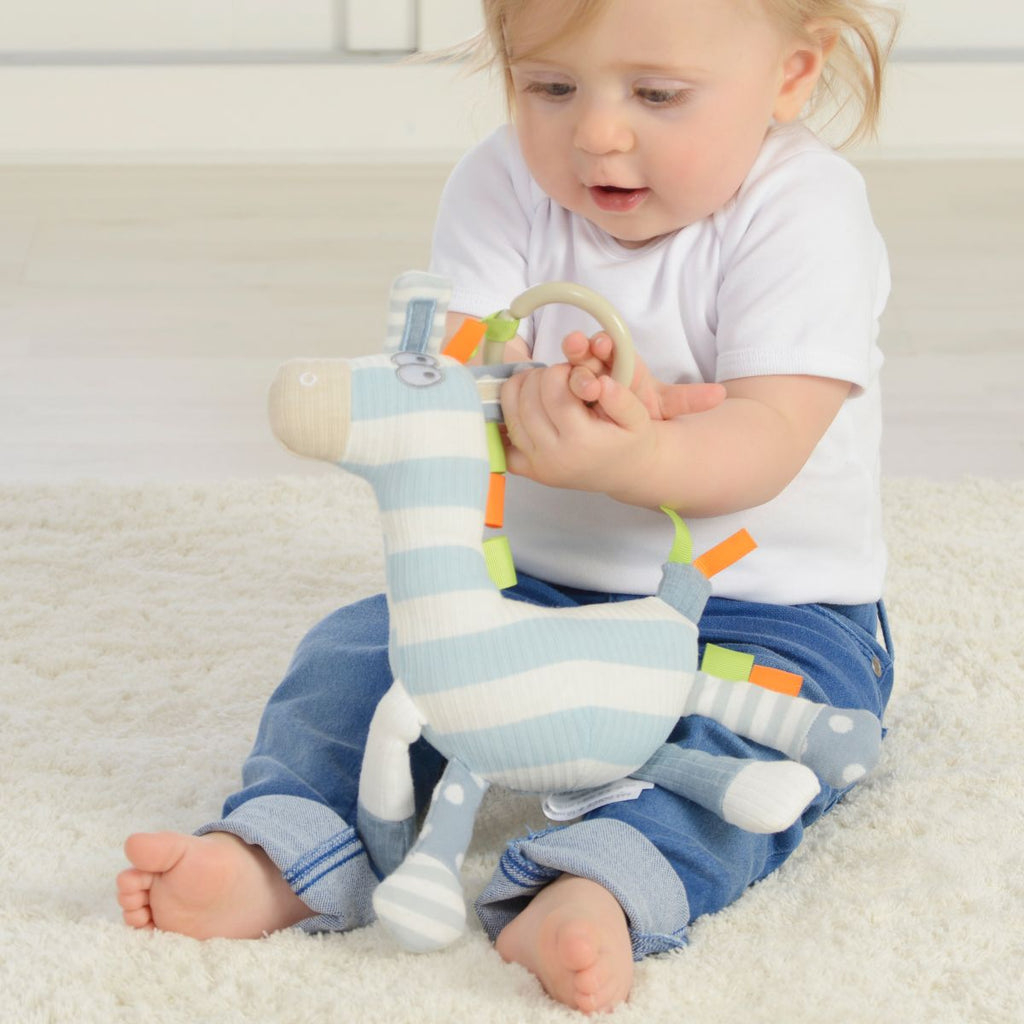 This soothing-colored Zebra is a perfect cuddly toy to play with right before sleep! It features ribbon tabs and a silicone teether. There is an attached ring that can be used as a connector or even as another teether, too. Your child will love the rattle and squeak sounds that it makes! Presented on a back card.