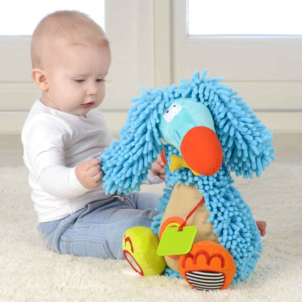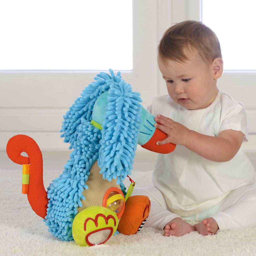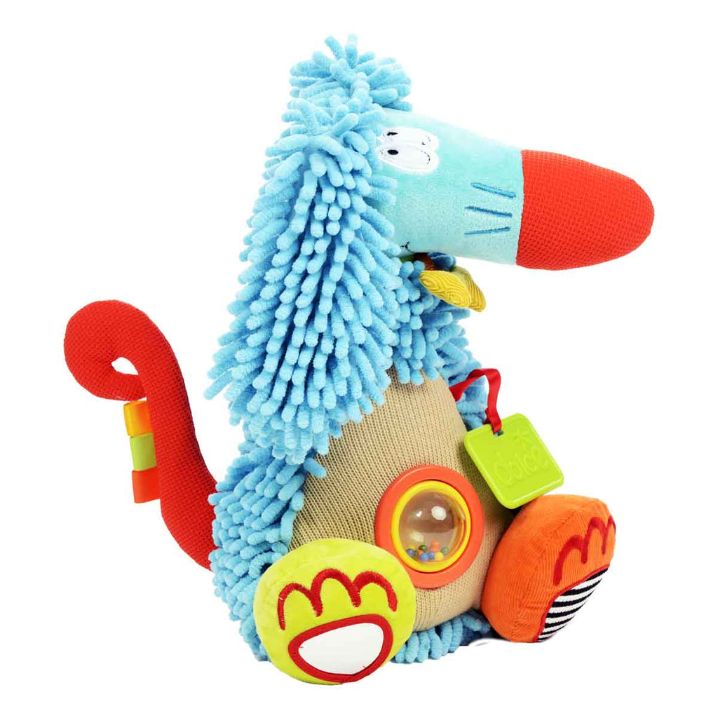 This large toy has various different activities to keep children entertained for hours. It is made from knitted fabric and contains mirrors, rattles, a squeaky flower in a pocket and teethers on the tail and ears. Presented on a Dolce branded hanging hook.Why Children Love this Toy? Sounds: Children will delight in creating sounds by using the internal bell. Color: The variation of color makes them highly engaging for inquisitive babies. Material: A high quality, safe design means babies can use different parts of the toy as teethers. Touch: The different textures, knots, beads and crinkle segments are extremely satisfying for children to play with. Educational Benefits: 3D design helps toddlers to discriminate different patterns by tactile play. Helps to connect motor skills with auditory learning by rattling the bell. Visual learning is provoked through color perception. Facial Recognition: The mirrors help children to develop an understanding of reflections from...