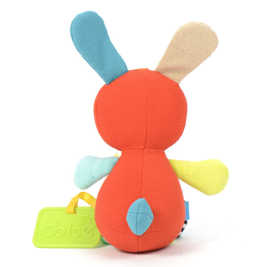 This large toy has various different activities to keep children entertained for hours. It is made from knitted fabric and contains mirrors, rattles, a squeaky flower in a pocket and teethers on the tail and ears. Presented on a Dolce branded hanging hook.Why Children Love this Toy? Sounds: Children will delight in creating sounds by using the internal bell. Color: The variation of color makes them highly engaging for inquisitive babies. Material: A high quality, safe design means babies can use different parts of the toy as teethers. Touch: The different textures, knots, beads and crinkle segments are extremely satisfying for children to play with. Educational Benefits: 3D design helps toddlers to discriminate different patterns by tactile play. Helps to connect motor skills with auditory learning by rattling the bell. Visual learning is provoked through color perception. Facial Recognition: The mirrors help children to develop an understanding of reflections from...