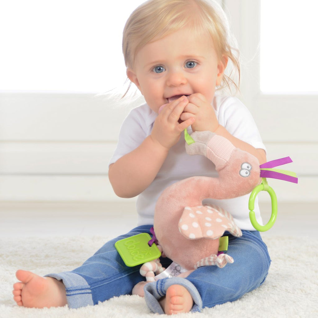 This huggable Flamingo is packed with knotties, both on the tail and on its feet. Also, it comes with a mirror, and it has a teether ring on the top...This huggable Flamingo is packed with knotties, both on the tail and on its feet. Also, it comes with a mirror, and it has a teether ring on the top of the toy, right next to the ribbons. There are plenty of activities with different types of textures and fun to discover. Presented on a back card.