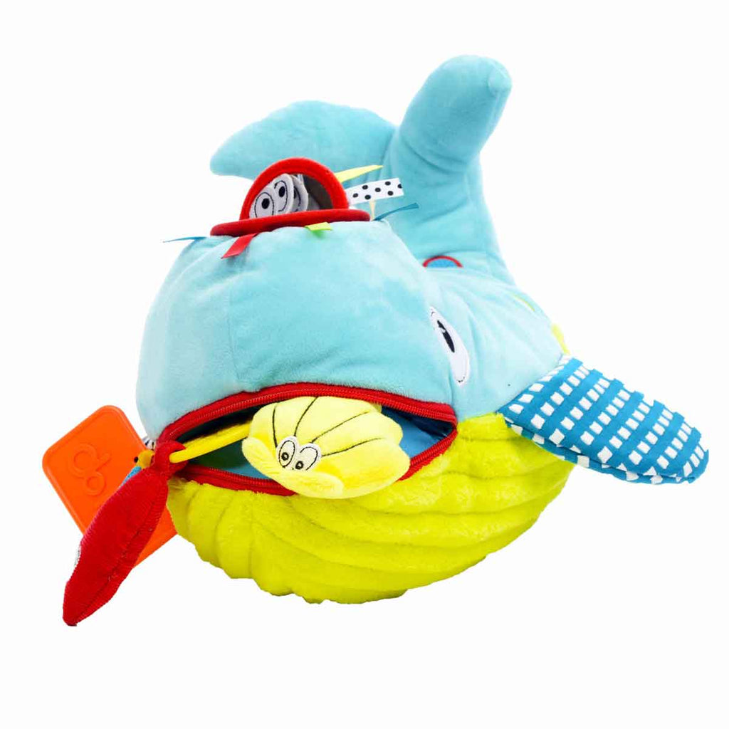 This large whale has a Blow hole and a zipper mouth that can be opened to retrieve the little toy fish, baby octopus or clam. The cute whale also has crinkle fins, and squeakers. The baby octopus is a mirror, the clam has a squeaker and the fish tail is a teether. Presented on a Dolce branded hanging hook.