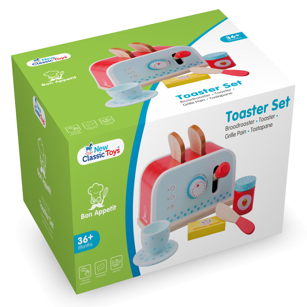 Wooden toy Pop-up Toaster. Includes 2 toast slices, a dial that turns and a pop up lever; plus jam, butter, knife and a cup with saucer. 19.5 x 12.5 x...Wooden toy Pop-up Toaster. Includes 2 toast slices, a dial that turns and a pop up lever; plus jam, butter, knife and a cup with saucer.