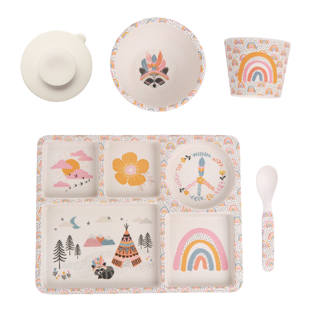 This Love Mae dinner set is made up of 5 pieces of quality bamboo items that are perfect for you and your little love.
