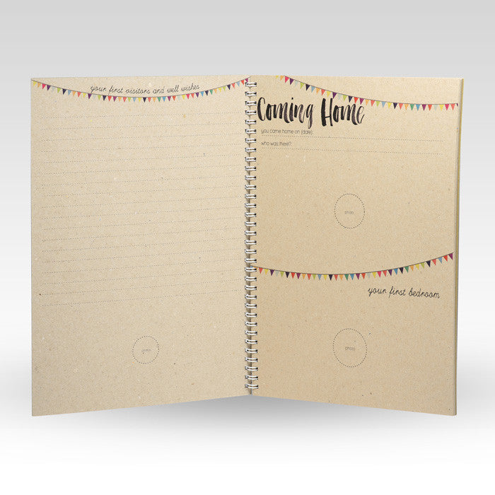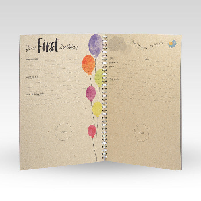 56 Page A4 spiral bound Baby Book printed on 100% recycled cardstock. Track your little one’s progress in this beautiful baby book… “a precious book of memories, milestones and firsts”56 Page A4 spiral bound Baby Book printed on 100% recycled cardstock.