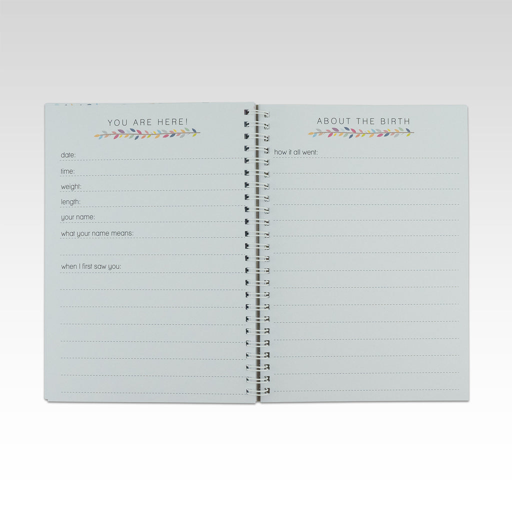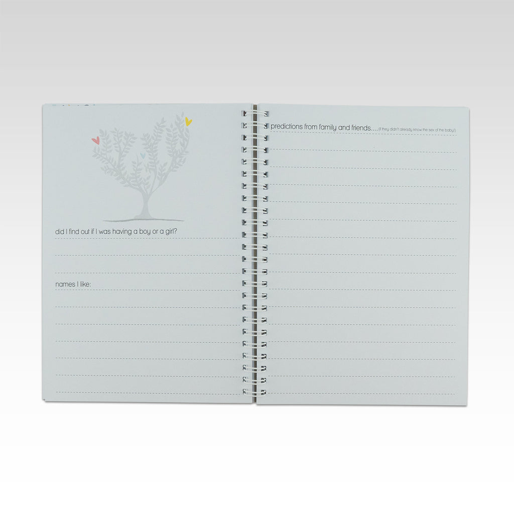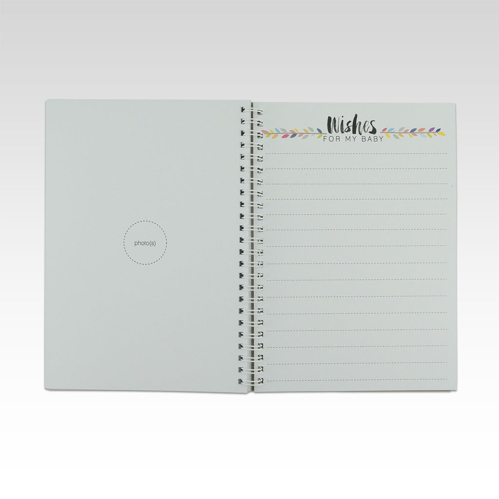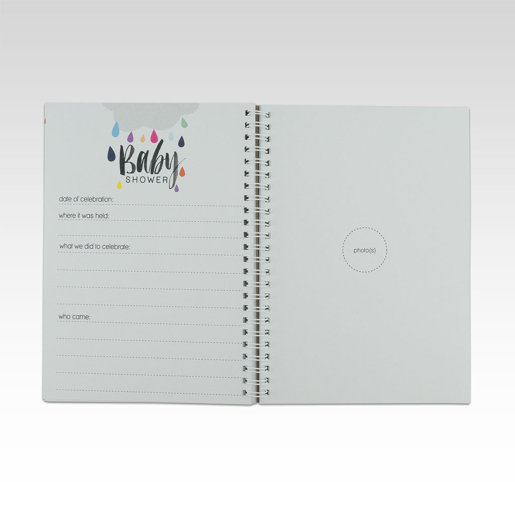 Pages for photos and other important keepsakes, an area to record details about a baby shower, gender predictions, about the birth and wishes for the new baby.