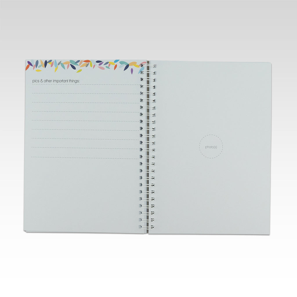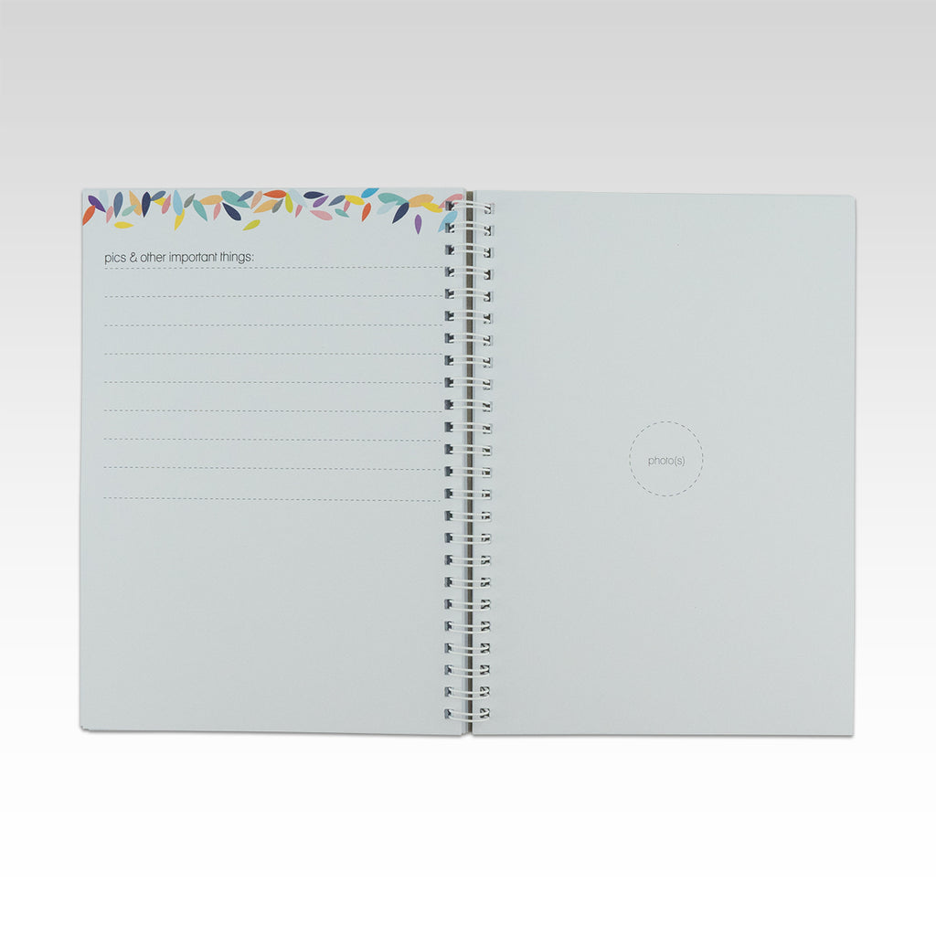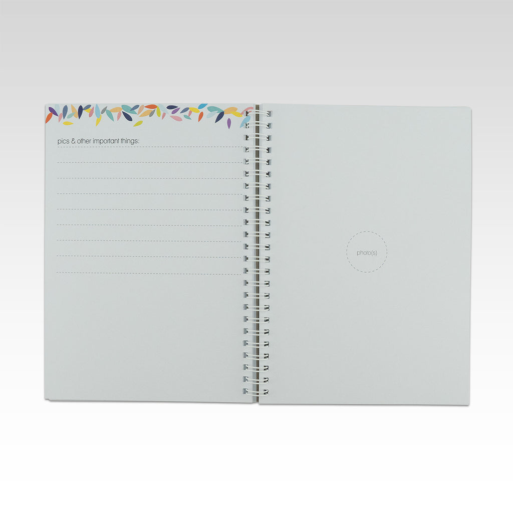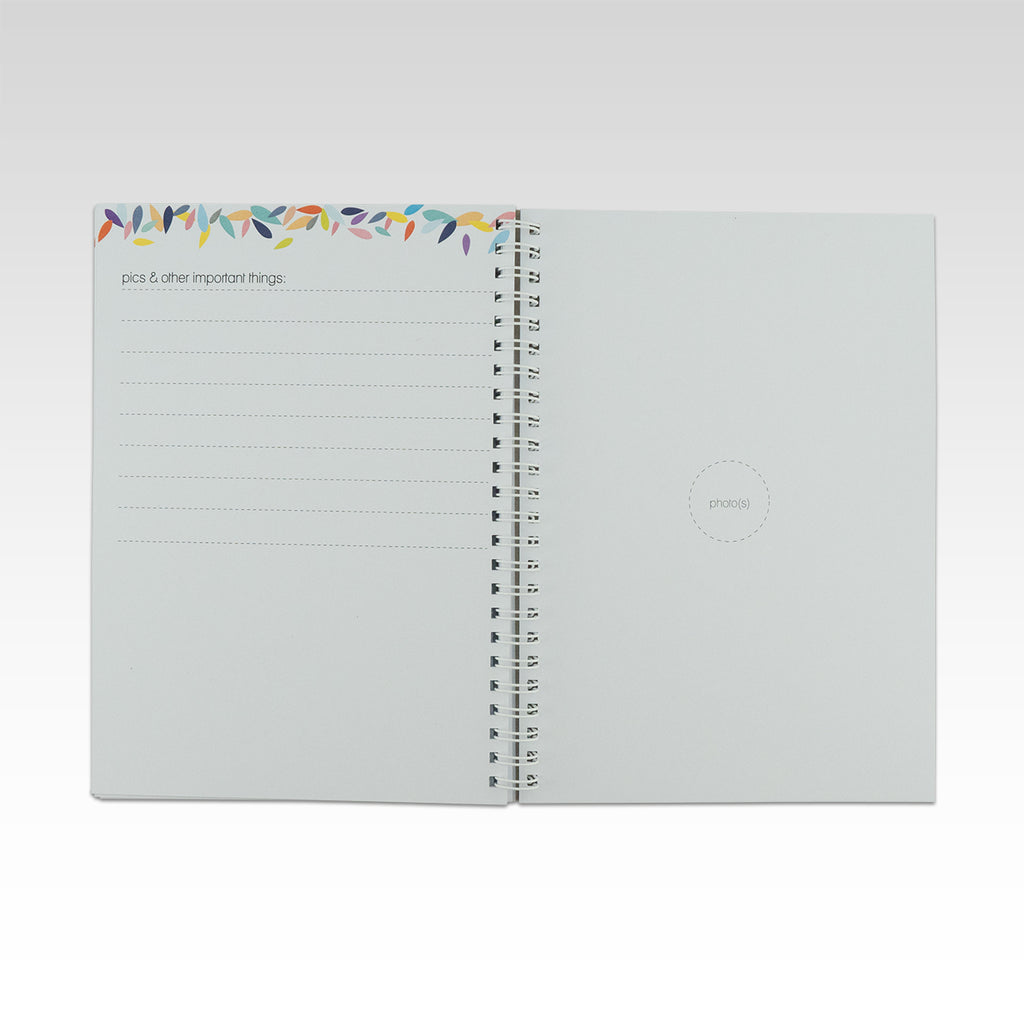 Pages for photos and other important keepsakes, an area to record details about a baby shower, gender predictions, about the birth and wishes for the new baby.