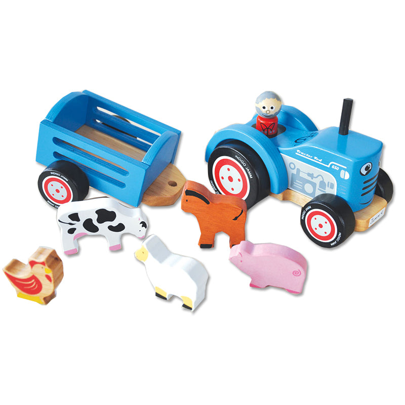 Introducing the Indigo Jamm Farm Tractor Set, a charming blue farm tractor with a detachable trailer, complete with five adorable wooden farm animals. Meet Farmer Tim, a removable peg person who can transport all the animals in his trailer.