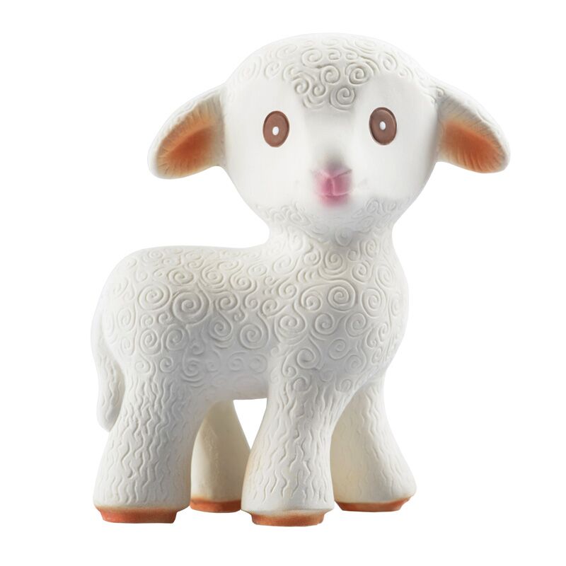 This lamb comes with surface textures that encourage tactile exploration while its ears and legs are shaped to act as a soother for mouthing babies. Squeaks when gently squeezed. 100% pure and natural rubber.