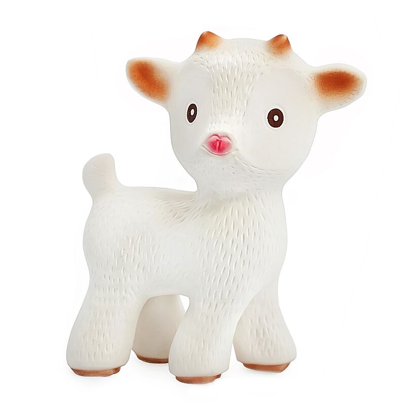 The teething toy starts as pure natural tree sap from the rubber tree Hevea that is minimally processed into durable 100% pure natural rubber. Certified BPA, PVC, Phthalate and Nitrosamine free, painted with food-grade paints, the toy is completely non-toxic. Our teething toy Sola the Goat is earth friendly, it is produced sustainably and is entirely biodegradable.