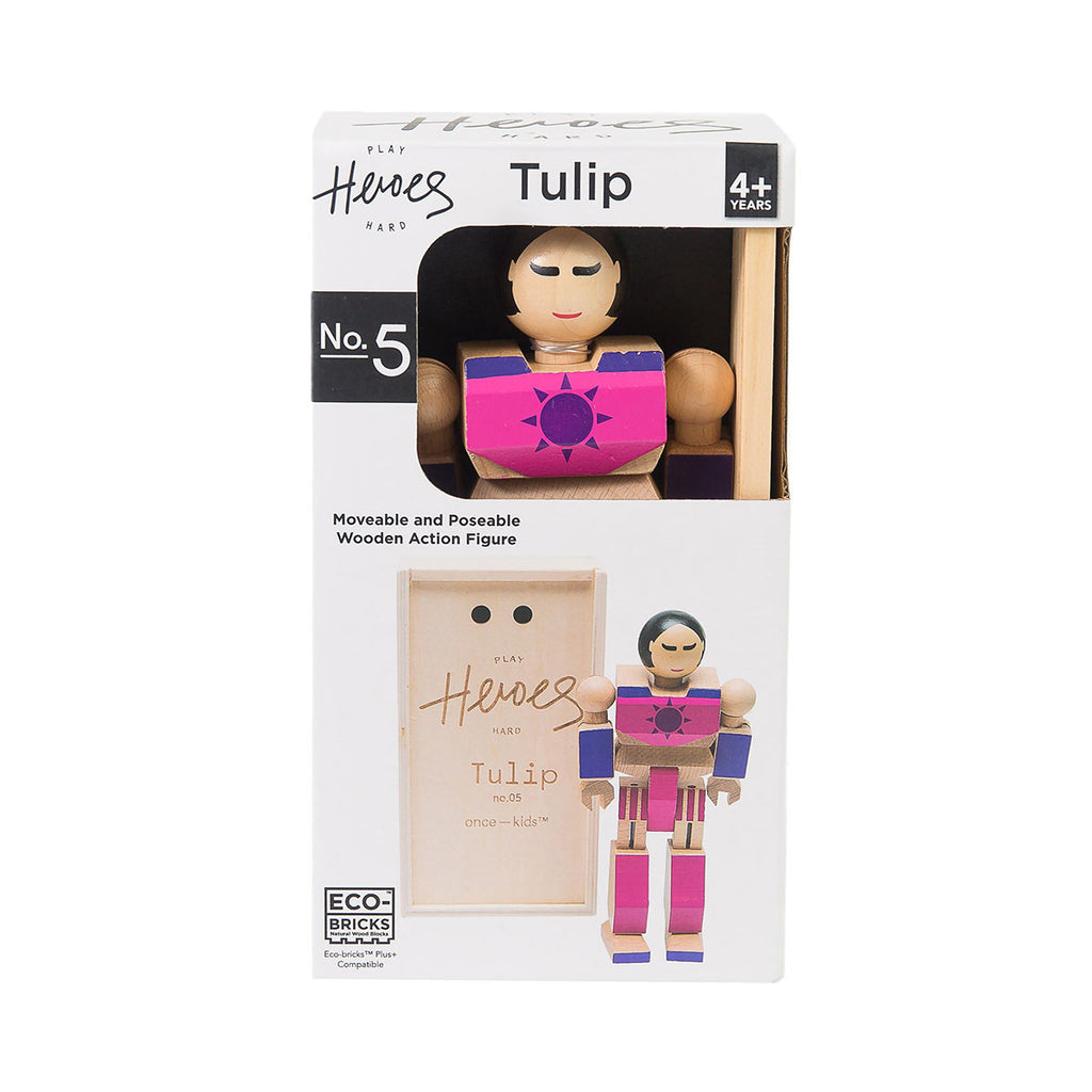Playhard Heroes - Tulip, built strong with superhero-worthy materials and packaged in an equally tough laser engraved wooden boxes, complete with chalkboard painted interiors, the Playhard Hero Action Figures are a brilliant alternative to the traditional plastic figures.