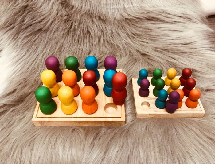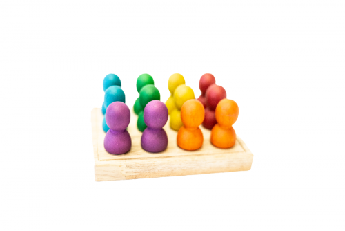 This set includes 12 rainbow colored wooden Omni people on a wooden tray. Perfect for your little ones to explore with small world play, role play, sorting and numeracy development.