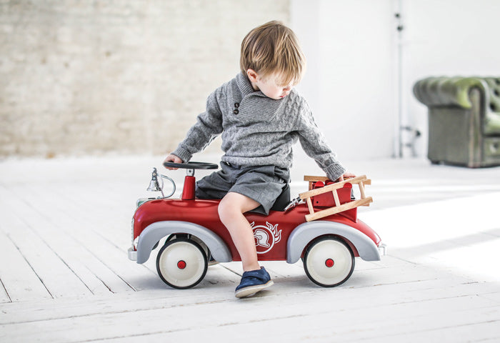 Constructed to be sturdy and stable, the speedster is reminiscent of a bygone era where things were built to last. It has a metal body and rubber tyres plus two ladders and a hose to help put out those bothersome fires!
